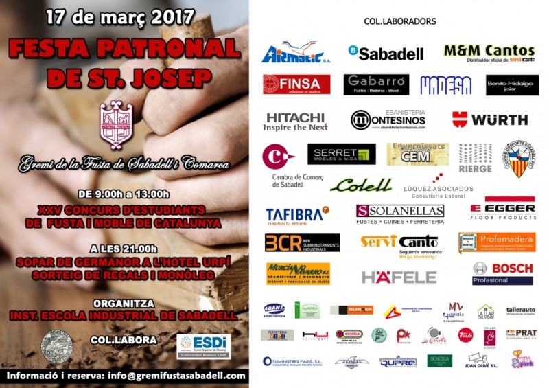 El Gremi de la fusta de Sabadell i comarca va celebrar durant el passat mes de març la tradicional festivitat de Sant Josep. Totes les fotos del concurs d'ebenisteria, del sopar i de la resta d'actes, poden visionar-se i descarregar-se prement sobre aquest enllaç.